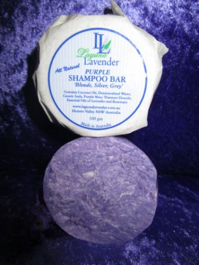Natural PURPLE Shampoo BAR 100gm for Blonde, Silver and Grey. No more nasty chemicals. Purple Mica balances any 'yellow tinge' plus revives and brightens for a better result. The Lavender essential oil and Rosemary oil adds a special fragrance as well for a special bonus. Contains Coconut Oil, Demineralised Water, Caustic Soda, Purple Mica, Titanium Dioxide and Essential Oils of Lavender [Lavandula Angustifolia] and Rosemary. 'How to Use' directions label on the back